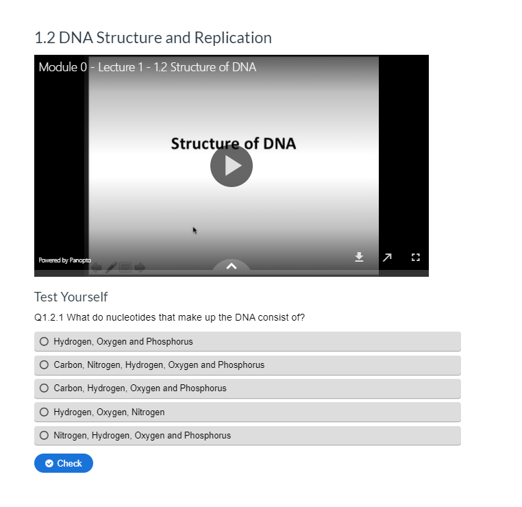 Instead of delivering a traditional 50 minute lecture, lecture plans are split into five shorter parts of 10 minutes. These are videoed on a laptop and uploaded into Canvas via Panopto. Students are issued with gapped notes to encourage them to follow the lecture and fill in missing information. Between lectures, multiple choice quizzes have been placed to check comprehension and aid memory retention.